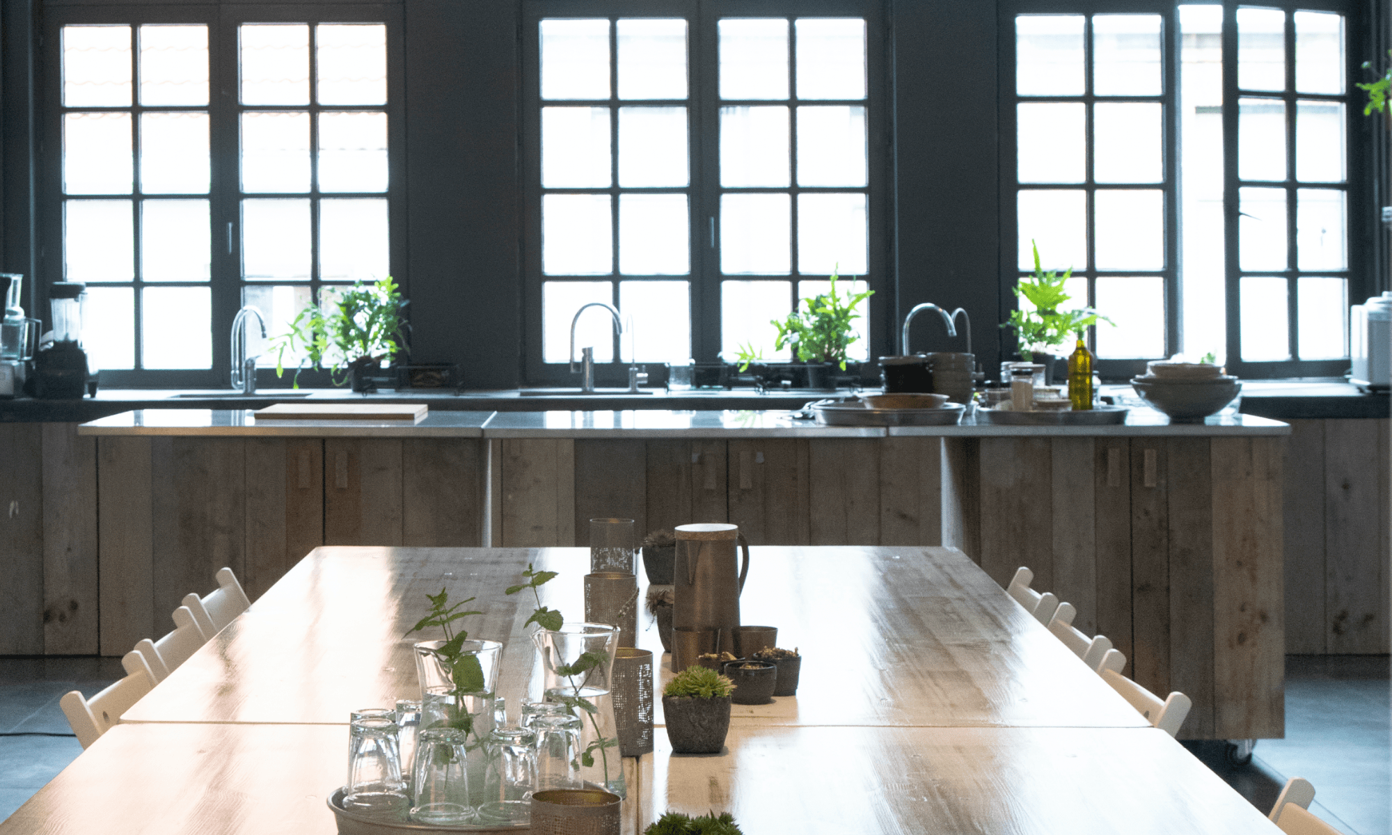 Open keuken uitgerust met professionele keukentoestellen, een 5-pit gasfornuis en trendy servies met het oog op gezellig en sfeervol proeven: Instagram proof, gemakkelijk en ontspannend want alles is aanwezig.